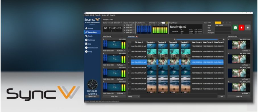 SyncVV is a recording system that instantly converts video input via SDI into MP4 files using H.265 encoding. A single system can record up to four channels of video and outputs video material files usable in post-production just a few seconds after recording stops.